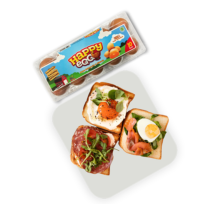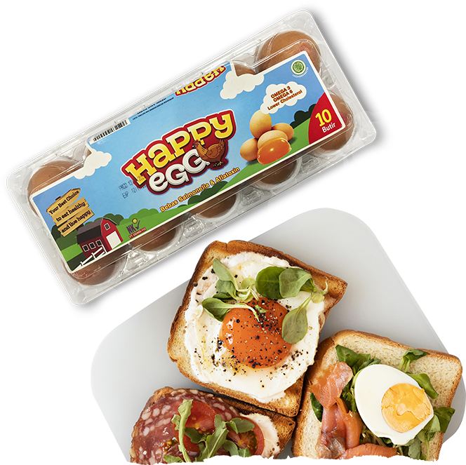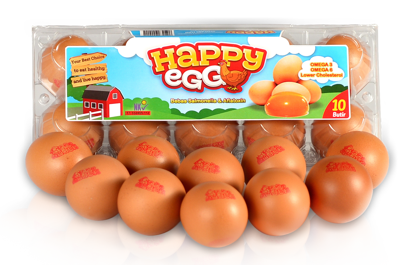 Produk Happy Egg merupakan inovasi terkini dari perusahaan kami telur yang lebih bergizi tinggi dari telur biasa dan lebih rendah kolesterol sehingga lebih aman dikonsumsi setiap harinya. Happy Egg mengandung omega 3, 6, dan 9 yang tinggi, organic & alami yang sangat diperlukan tubuh kita, bebas antibiotika, mengandung probiotik dan selenium yang sangat cocok untuk mendukung pertumbuhan anak anak maupun dewasa.